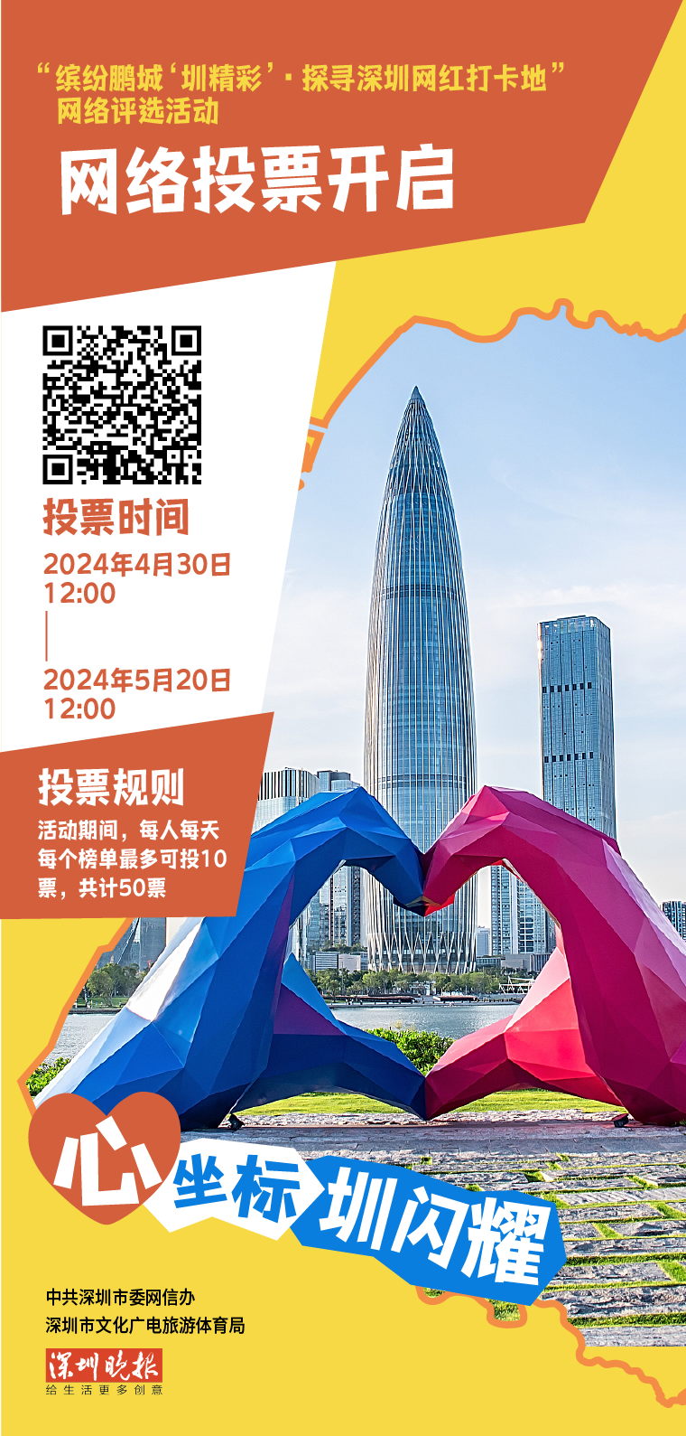 “探寻深圳网红打卡地”网络评选活动目前处在网络投票环节,将于2024年5月20日12时截止投票,欢迎大家继续踊跃投票。最终活动将评选出“深圳网红打卡地”魅力都会、山海连城、赛博深圳、探迹岭南、漫行鹏城五大类榜单,为深圳市民、来深游客提供最新鲜热辣、更具代表性的游览打卡指南。