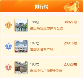 自3月活动启动以来,主办方收到了来自深圳各区政府单位、网友推荐的300余个地点,经过初筛,共有213个打卡地入围投票环节。其中有三处公厕入围,分别是市民中心广场8号公厕、莲花山公园山顶公厕、上步绿廊公园街头小型公共洗手间。截至5月13日20时,213个打卡地总票数已超103万,市民中心广场8号公厕暂列第3,票数23328。