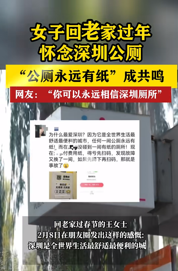 深圳公厕频频出圈,女子回老家过年怀念深圳公厕 ,“公厕永远有纸”成共鸣,网友:“你可以永远相信深圳厕所”。在社交平台上,不少离深的深圳人都在怀念深圳的公厕 ,“深圳厕所干净不说,有空调不说,有的还有淋浴间,最重要的是还有纸哦”“有好几个公园的厕所都成了网友打卡的网红点……”