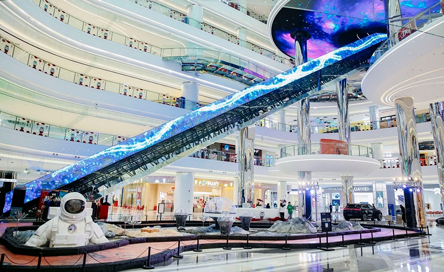 不错,这是通常都市商场给人们的印象。不过,在龙岗平湖的万达广场,逛商场的体验完全可以插上想象力的翅膀去感受:体验过常见的商场项目后,您可以搭乘商场中庭60多米的超长梦幻扶梯,穿越闪烁星光色彩的“天眼”,体验飞天的感觉;可以在77.77米的玻璃栈道上,感受鹊桥的烂漫;可以仰观2500平方米的LED巨幕天花板,其上除了梦幻的场景,更有可互动的弹幕,整点的红包雨……