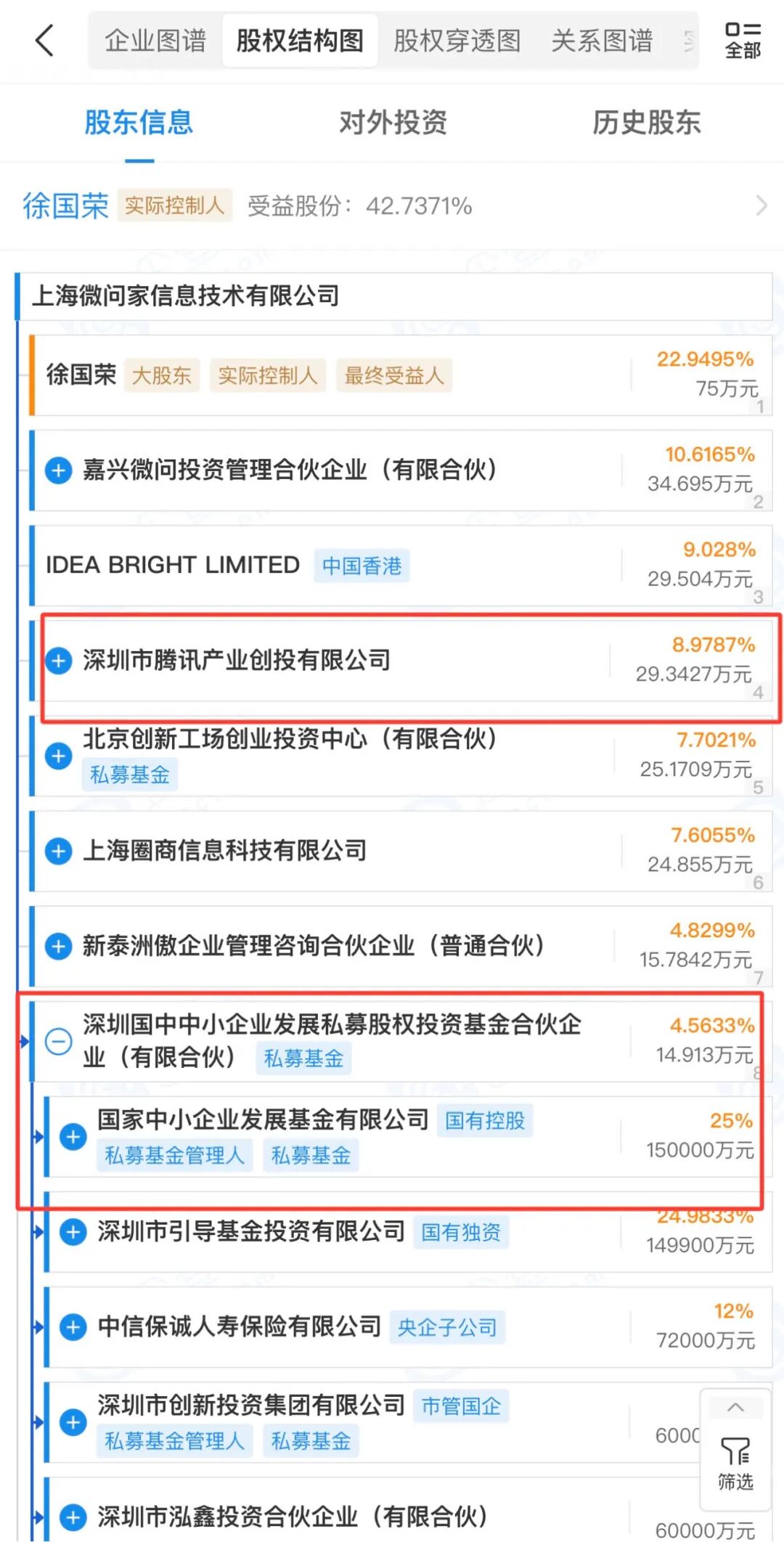 经查询,微问家股东包含深圳市腾讯产业创投有限公司(持股8.98%)及深圳国中中小企业发展私募股权投资基金合伙企业(持股4.56%)。后者被国家中小企业发展基金有限公司持股25%。