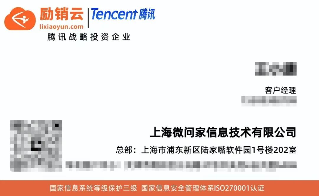 记者注意到,该销售人员名片上使用了腾讯标识,微信名称也特别标注“腾讯励销云~某某”,但其出示的销售合同模板上并未出现腾讯字样。