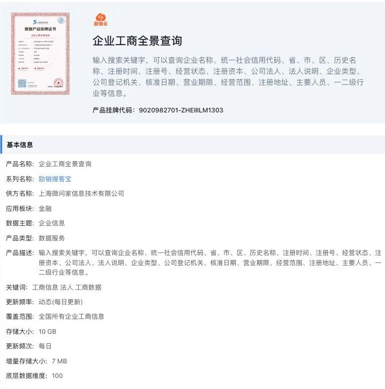 记者查阅“企业工商全景查询”挂牌证书发现,该证书对应的产品描述中并未包含“提供法定代表人联系方式”的许可,该公司在上海数交所的其他挂牌证书也未包含该许可。
