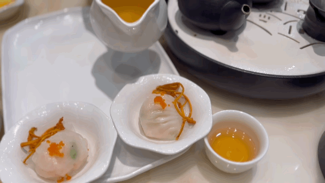 新派人气手工粤式点心中,他们家的招牌匠传参汤鲜虾饺皇绝对值得一试。品尝虾饺前,店员会仔细地将热腾腾、清甜的鸡汤倒入其中,而鸡汤中还添了虫草花,增添了一抹别致的香气。虾饺的皮质软而有嚼劲,馅料则是选用了大颗且饱满的虾肉,鲜美Q弹,吃了还想吃。