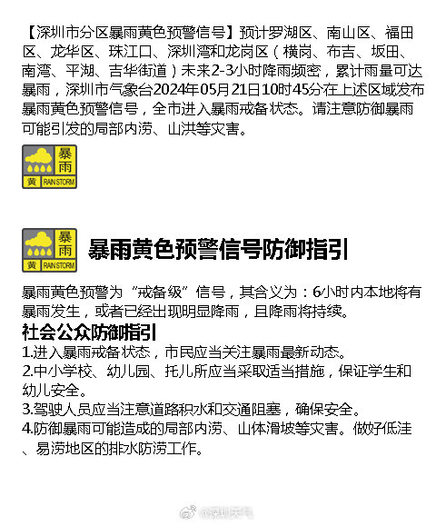 【深圳市分区暴雨黄色预警信号】预计罗湖区、南山区、福田区、龙华区、珠江口、深圳湾和龙岗区(横岗、布吉、坂田、南湾、平湖、吉华街道)未来2-3小时降雨频密,累计雨量可达暴雨,深圳市气象台2024年05月21日10时45分在上述区域发布暴雨黄色预警信号,全市进入暴雨戒备状态。请注意防御暴雨可能引发的局部内涝、山洪等灾害。