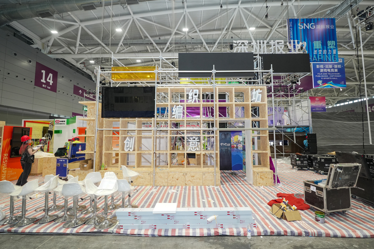 5月21日下午,在深圳国际会展中心14号馆,第二十届文博会深圳报业集团展区内的工人们正紧张地进行最后一批钢梁的搭建。一个多小时之后,展品和设备将陆续进场,一场过去与未来的文化画卷将在这里展开。