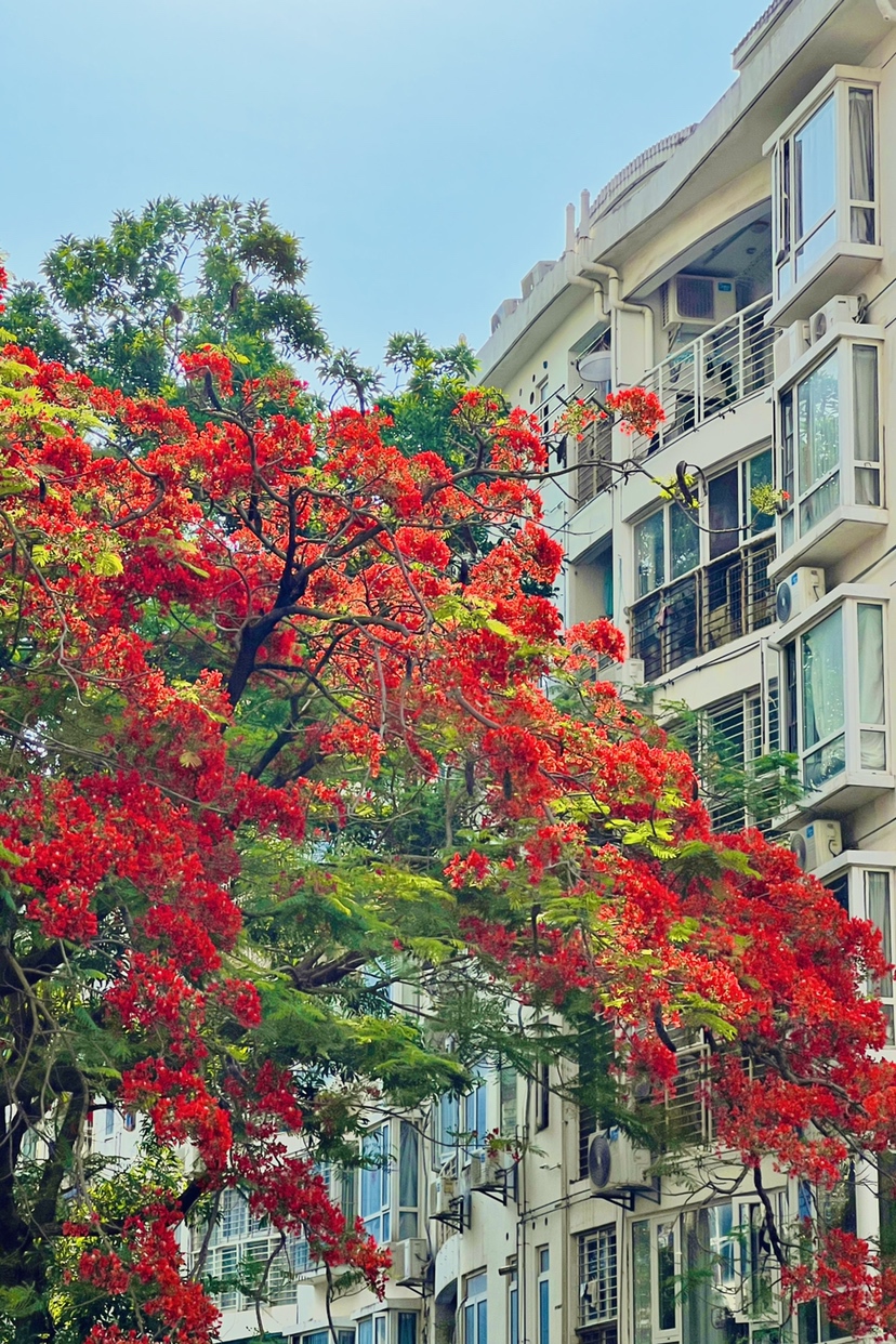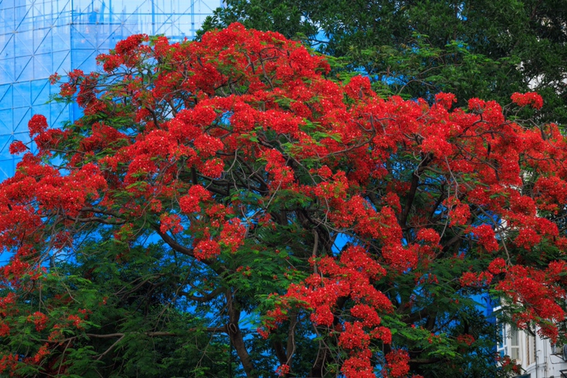 凤凰木源自非洲的马达加斯加岛,作为著名的热带观赏树种,被誉为世界上色彩最鲜艳的花木之一,近年来被深圳引种为行道树,栽种在街头巷陌或者公园里。经过冬天的休眠和春天的蓄力,凤凰花在初夏时节绚丽盛开,火红的花朵点缀在郁郁葱葱的树木中,色彩亮丽,灿若云霞。这个时节,无论你行走深圳何处,总能在万绿枝头中,邂逅这抹耀眼的“凤凰红”。