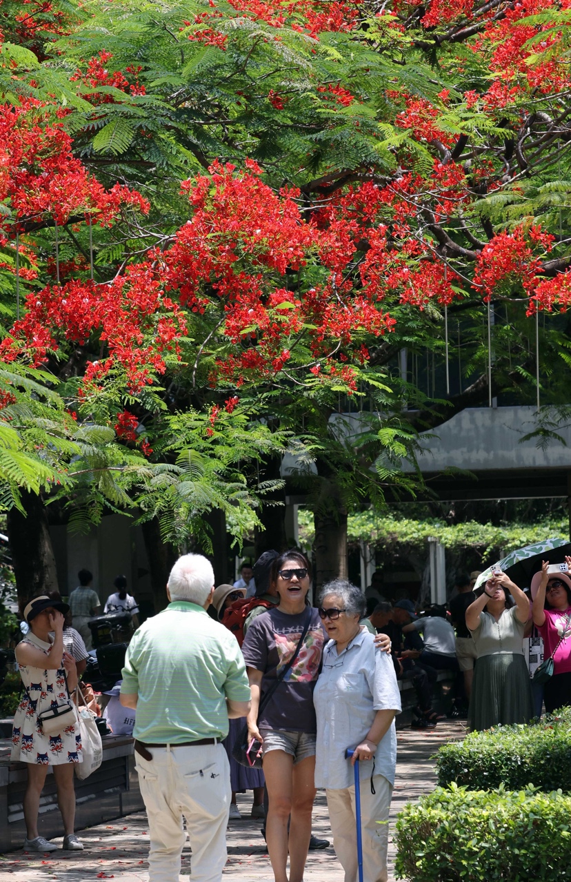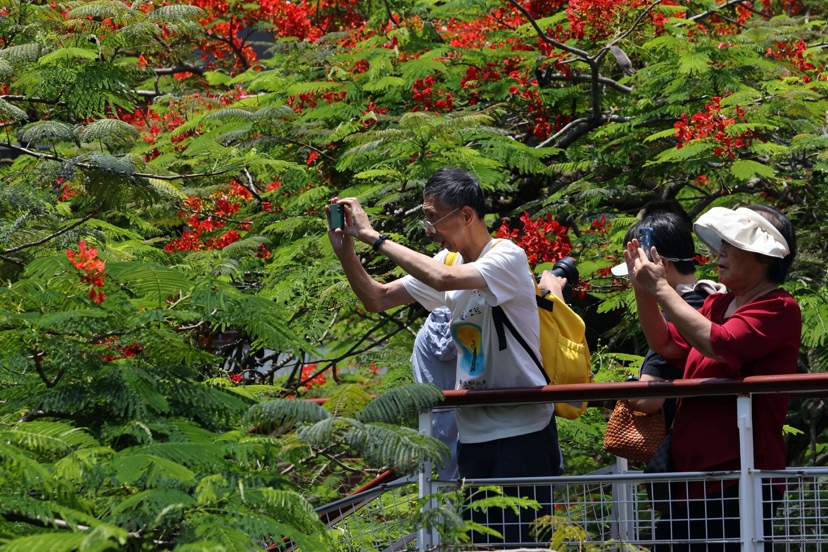 东湖公园是深圳最早大批量栽培凤凰木的公园,尤其是杜鹃园里的凤凰木景观林,数百棵凤凰木连绵成片,花开时犹如火红的海洋、蔚为壮观。梅林公园和洪湖公园的凤凰花也开了,与近处的假山、雕塑、凉亭,还有广阔的草地“同框”,书写着夏日的浪漫与美好。