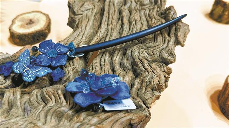 5月22日下午,十八洞苗绣的展台前人头攒动,走近一看,原来是一批绽放深幽蓝色光泽的苗绣饰品引入关注。这些饰品均为手工制作,外观圆润,双面绣的工艺使得饰品呈现出更加立体精美的质感。“双面绣最大的特点就是更加平滑,线头被收在绣线的内部,显得十分饱满。宝石蓝是苗族和土家族传统中的常用色,我们此次带来的饰品都是采用了这种色彩,为炎热的夏天带来一丝清爽。这些饰品采用湘西的蚕丝布,我们特意挑选原木配饰架进行展示,希望带给观众更加贴近大自然的视觉体验。”负责人胡发彦说。戴女士是一名布展人员,她现场毫不犹豫地买下了一对苗绣的蝴蝶耳环,“我早就听说过十八洞的扶贫公益活动,这次见到真品真是‘狠狠心动’了!刚进展馆就一眼就看到了这对蓝色蝴蝶,非常喜欢。”