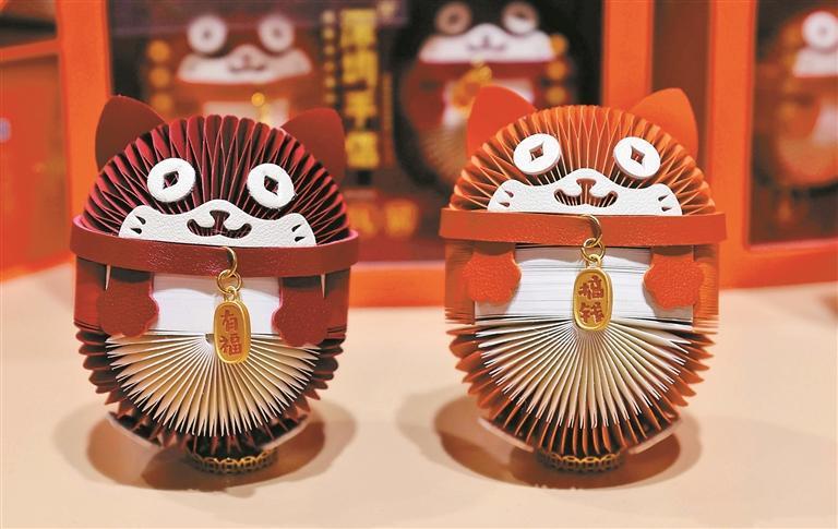 作为深圳本土原创IP,“搞钱猫”的设计灵感来源手风琴,它运用了手工纸质工艺,猫猫脖子上还挂着铃铛,一面写有“搞钱”,一面印着“有福”,都是让人欣喜的吉祥话。
