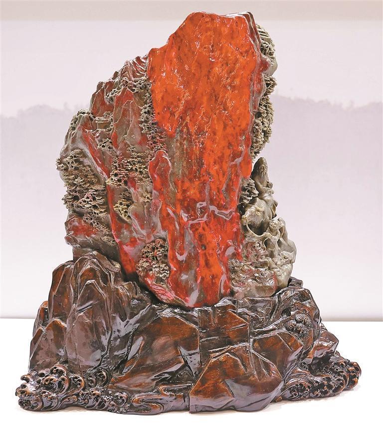 ▲鸡血石雕《老子出关》。深圳晚报记者 陈玉 摄