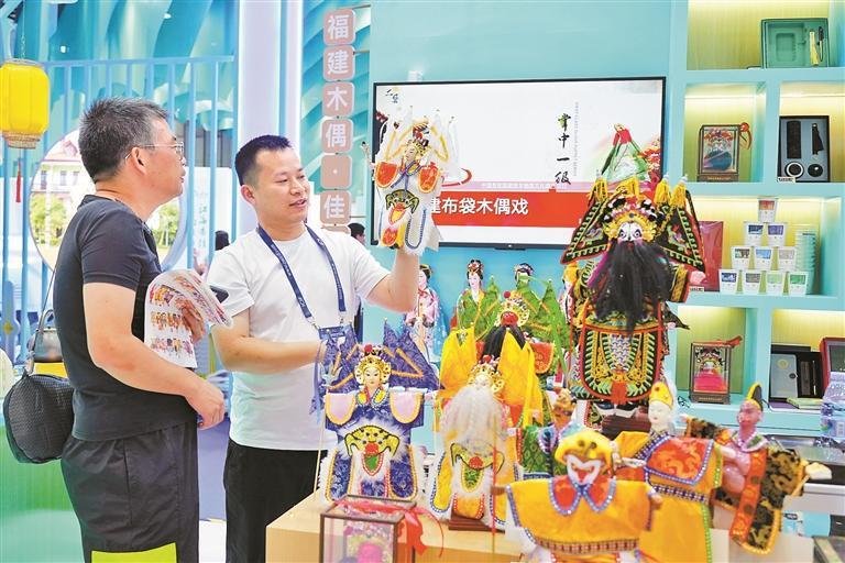 提到福建,大家可能会想到今年爆火的“蟳埔簪花”。事实上,福建实际上仍藏有很多非遗“宝藏”,福建布袋木偶戏便是其一。走进11号馆内的福建展区可以看到,两位表演老师穿梭于舞台中央,一边提着操纵绳,一边手举木偶小人儿,配上传统戏曲音乐,为现场观众带来精彩有趣的福建布袋木偶戏表演。