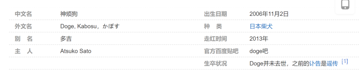 神烦狗doge也可能是目前为止影响力和引申应用范围最广的meme图之一,在中文互联网中,doge很长一段时间内被作为“单身狗”的指代,在社交平台广泛传播。以doge为原型,还出现了一种名为“狗狗币”的虚拟货币,这是第一个meme虚拟货币。