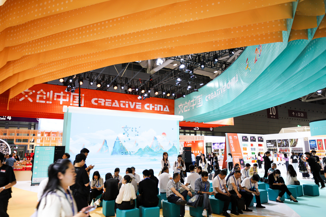 “文创中国”展区整体以“文”字为主创意元素进行布局设计,站在展区,抬头即可见一个巨大的“文”字,是当之无愧的“天花板”。
