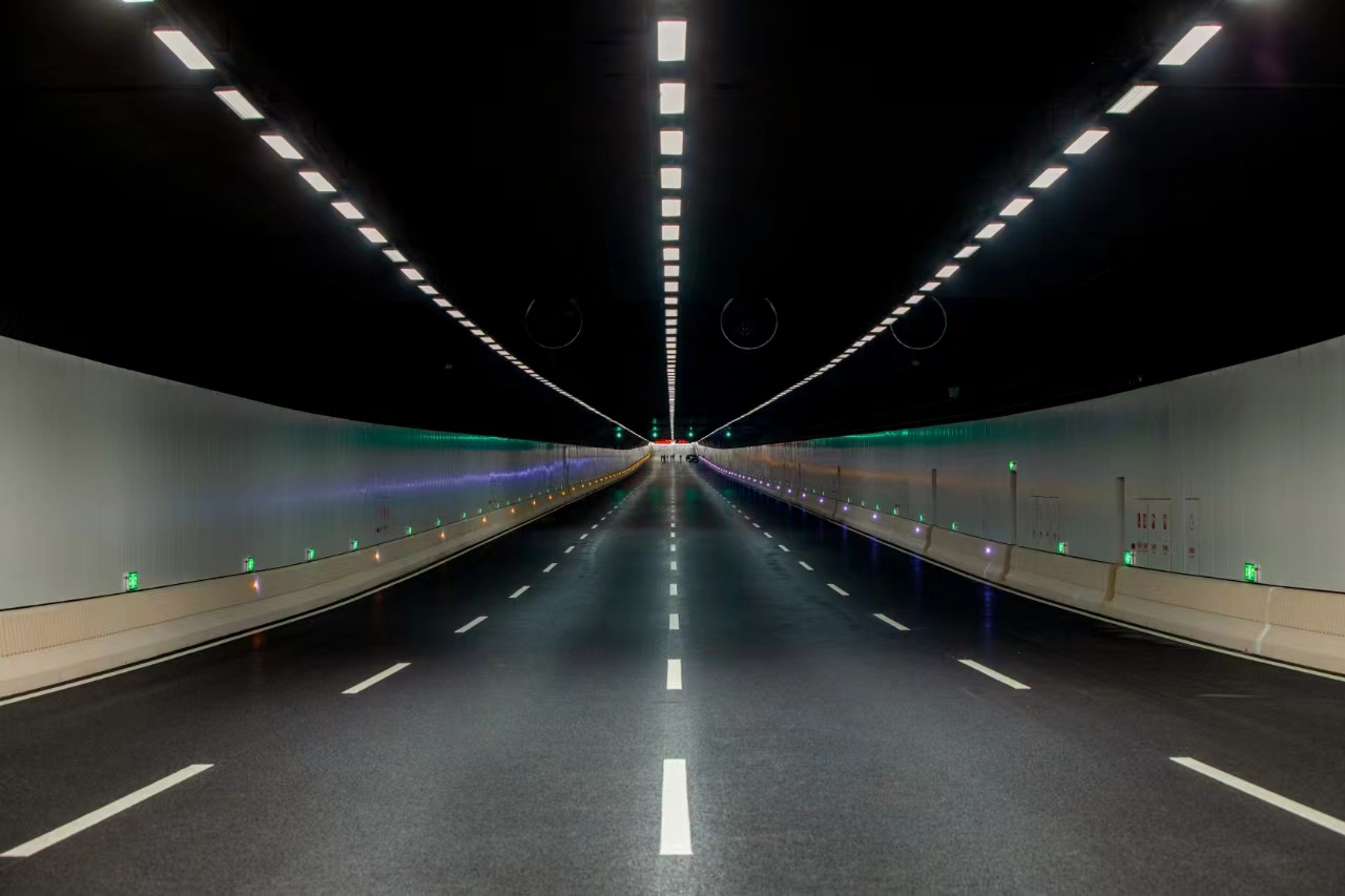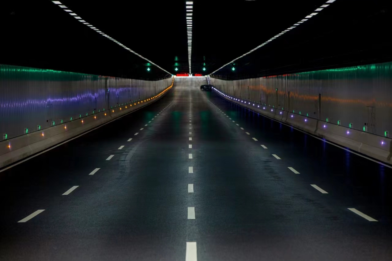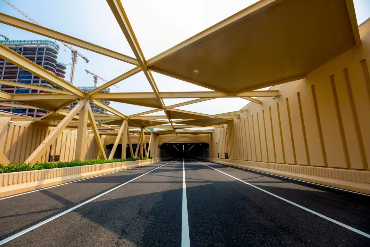滨海大道下沉隧道整体采用“消隐式”装修,在隧道内行车时基本看不到管线,呈现出简约大气的风格。隧道出入口采用钢结构框架,顶部镶嵌小块密集的钢结构,装上吸声板,其余处则直接镂空。当日光自然投射进隧道,就会形成星星点点的光亮,实现“引景入城”的空间效果。这种创新设计不仅在视觉上更加美观,还能帮助司机在行车时更好地适应明暗光线变化,提高驾驶安全性。