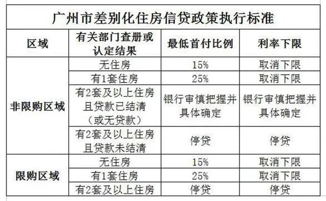 记者从中国人民银行广东省分行了解到,广东市场利率定价自律机制按照因城施策原则,根据当地房地产市场形势变化及市政府调控要求,对广州市差别化住房信贷政策作以下调整: