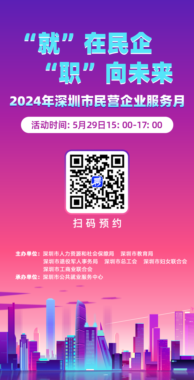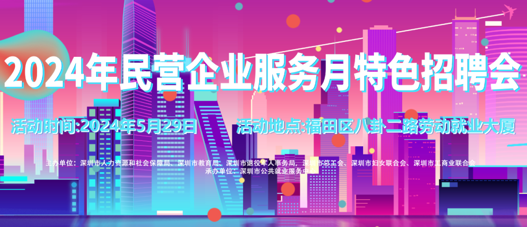 5月29日(周三)9:00-12:00,在福田区八卦二路劳动就业大厦二楼招聘大厅,由深圳市人力资源和社会保障局主办、深圳市公共就业服务中心承办的“2024年民营企业服务月特色招聘会”明日又上新一场线下招聘活动。