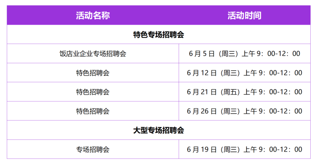 没有心仪的岗位怎么办?接下来还有众多公益招聘会密集上新!6月将举办4场特色专场招聘会,每逢周三上午举行。此外,6月19日(周三)9:00-12:00,还将举办一场大型专场招聘会。