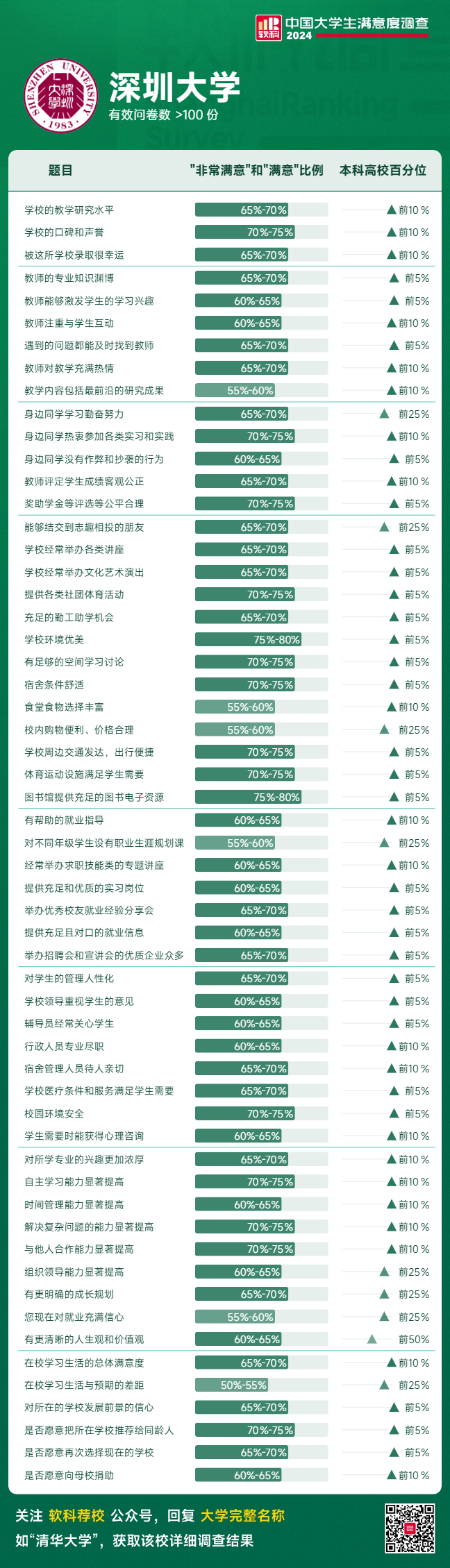 软科中国大学生满意度调查是软科面向全国大学生开展的关于大学经历满意度的调查项目,通过软科调查小程序开展,旨在收集中国2000多所高校的学生对所在高校的课程教学、校园生活、就业支持、后勤服务以及个人成长方面的感受和体验。