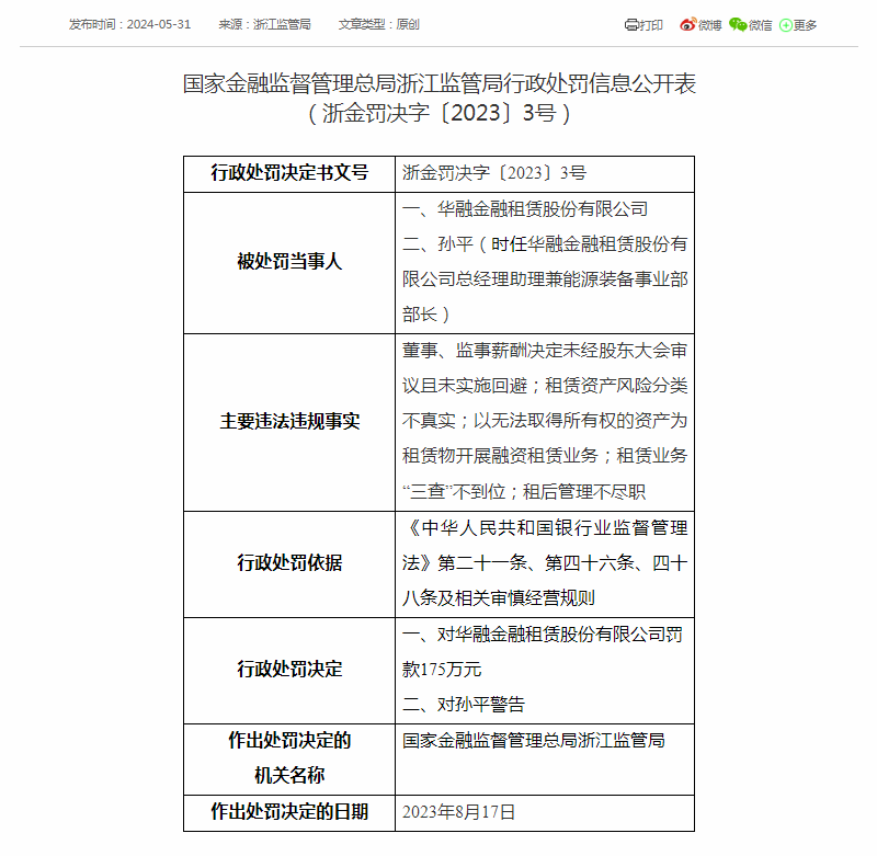 另据5月31日披露的行政处罚信息,华融金融租赁股份有限公司因多项违法违规事实,被浙江监管局开出数张罚单,合计罚款金额达325万元,并有多名相关责任人被罚。其中,因董事、监事薪酬决定未经股东大会审议且未实施回避;租赁资产风险分类不真实;以无法取得所有权的资产为租赁物开展融资租赁业务;租赁业务“三查”不到位;租后管理不尽职。公司于去年8月被罚款175万元,时任公司总经理助理兼能源装备事业部部长孙平被给予警告。