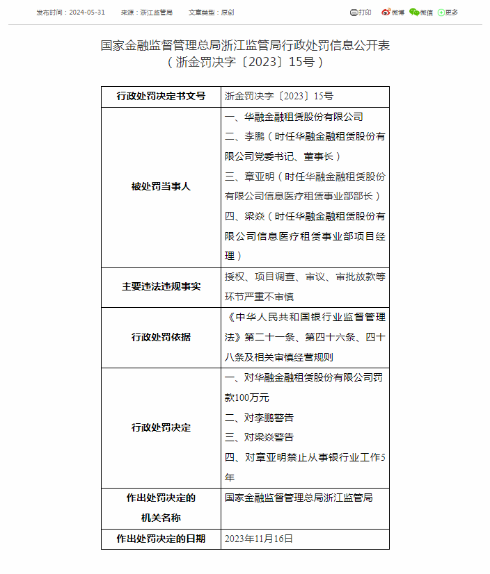 去年11月,因授权、项目调查、审议、审批放款等环节严重不审慎,公司被罚款100万元;时任公司党委书记、董事长李鹏,时任公司信息医疗租赁事业部项目经理梁焱均被警告;时任公司信息医疗租赁事业部部长章亚明被禁止从事银行业工作5年。