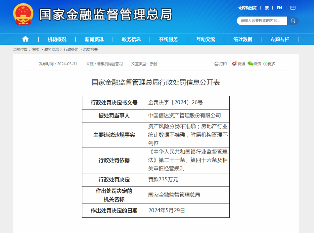 行政处罚信息公开表显示,中国信达资产管理股份有限公司因资产风险分类不准确;房地产行业统计数据不准确;附属机构管理不到位,于5月29日被国家金融监督管理总局罚款735万元。