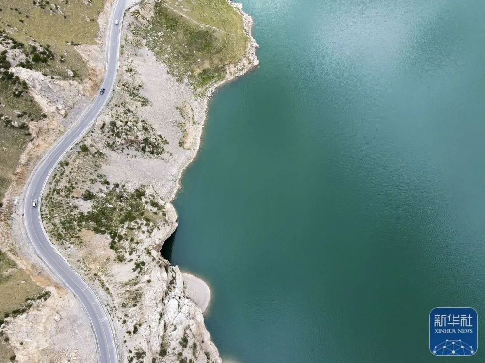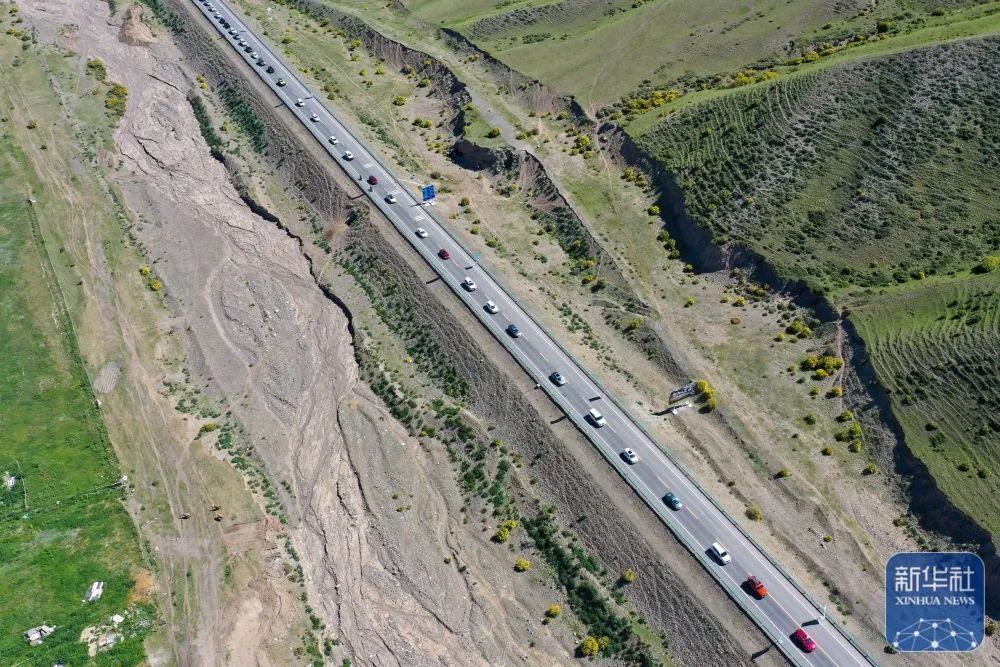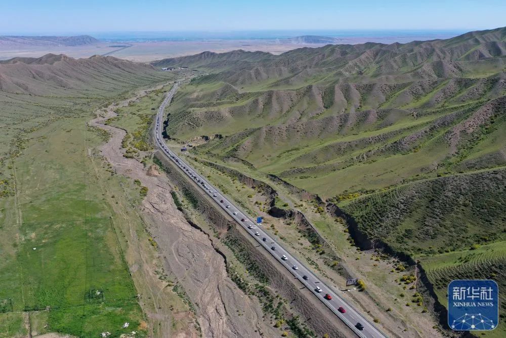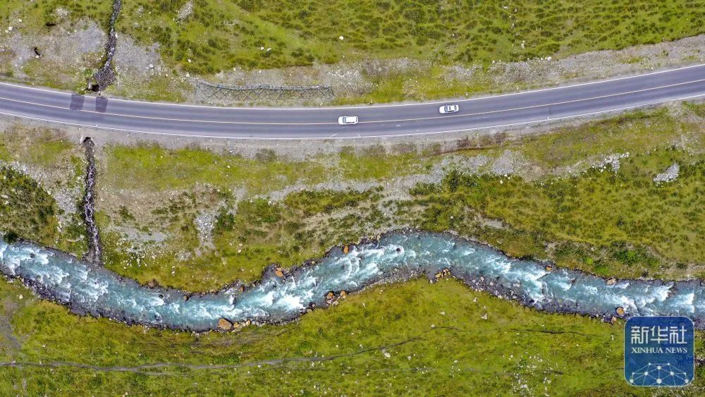 车辆行驶在新疆独库公路上(2021年6月20日摄,无人机照片)。