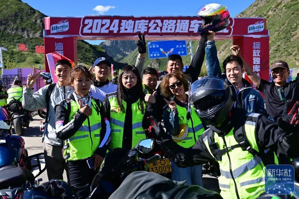 6月1日,在新疆塔城地区乌苏市独库公路驿站,摩托车手在通车仪式前合影留念。