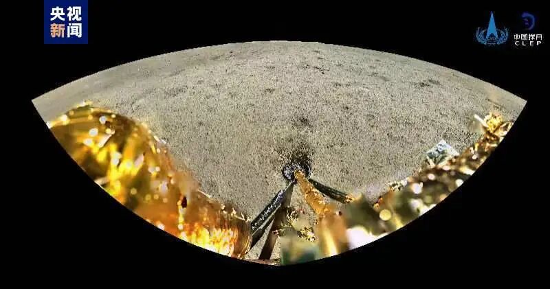 此影像图由全景相机在嫦娥六号表取采样前,对着陆点北侧月面拍摄的彩色图像镶嵌制作而成。图像上方是着陆点北部查菲环形山,图像的下方是着陆腿和着陆时冲击挤压隆起的月壤。