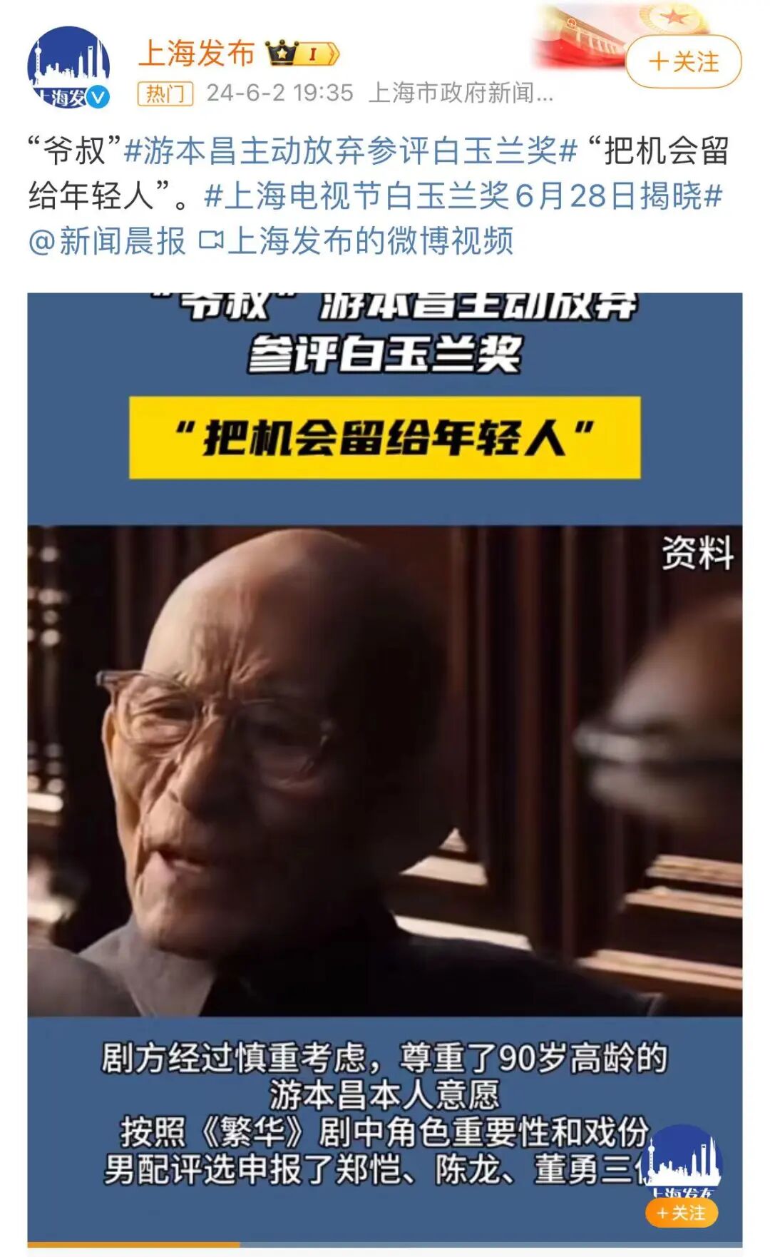 游本昌主动放弃参评白玉兰奖