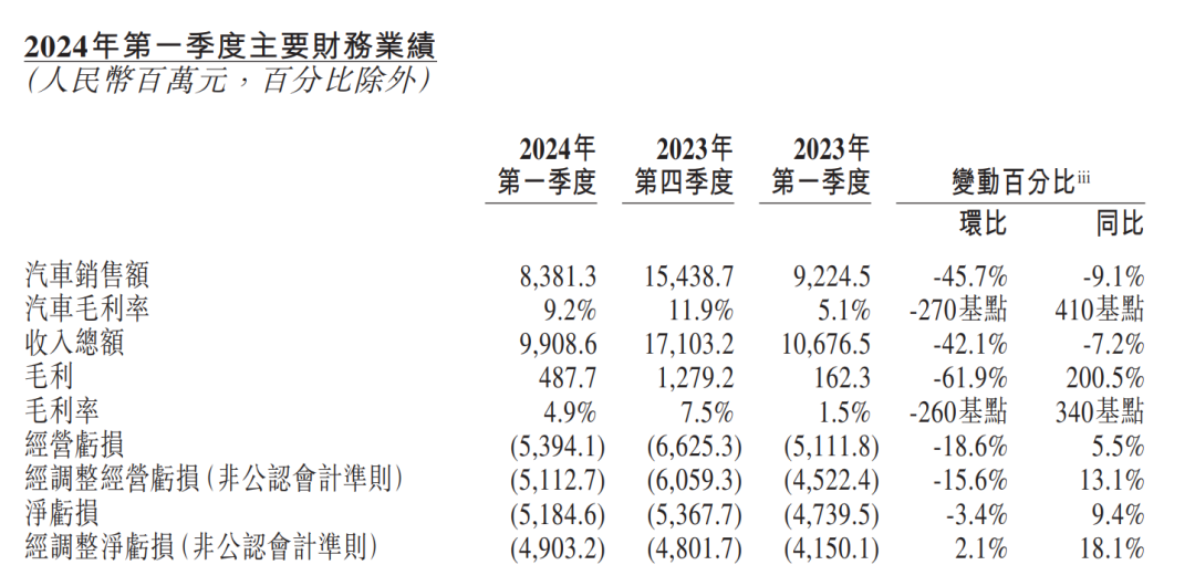 此前,市场颇为关注蔚来的亏损状况,从一季度来看,其亏损额环比明显收窄。数据显示,其一季度经调整经营亏损为51.12亿元,环比减亏15.6%。