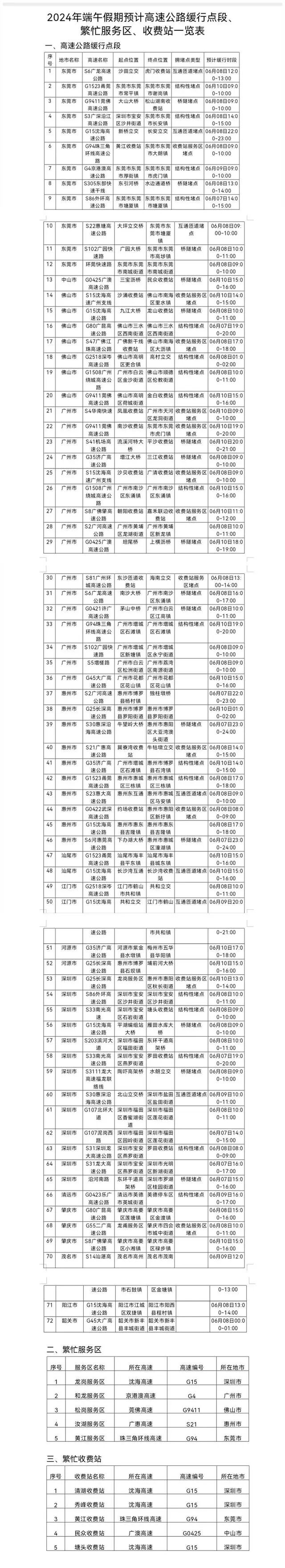 缓行点段、繁忙服务区、收费站如下