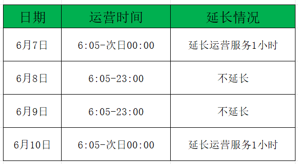 6月7日、10日,有轨电车延长运营服务时间1小时(运营时间为06:05-次日0:00),其余日期运营时间维持不变。