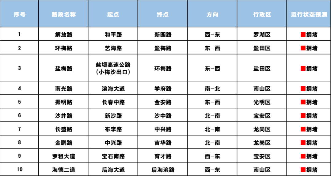 预计假期期间,罗湖区解放路,盐田区环梅路、盐梅路,南山区南光路、海德二道,光明区振明路,宝安区沙井路、罗租大道,龙岗区长盛路、金鹏路等部分路段交通运行压力较为显著。