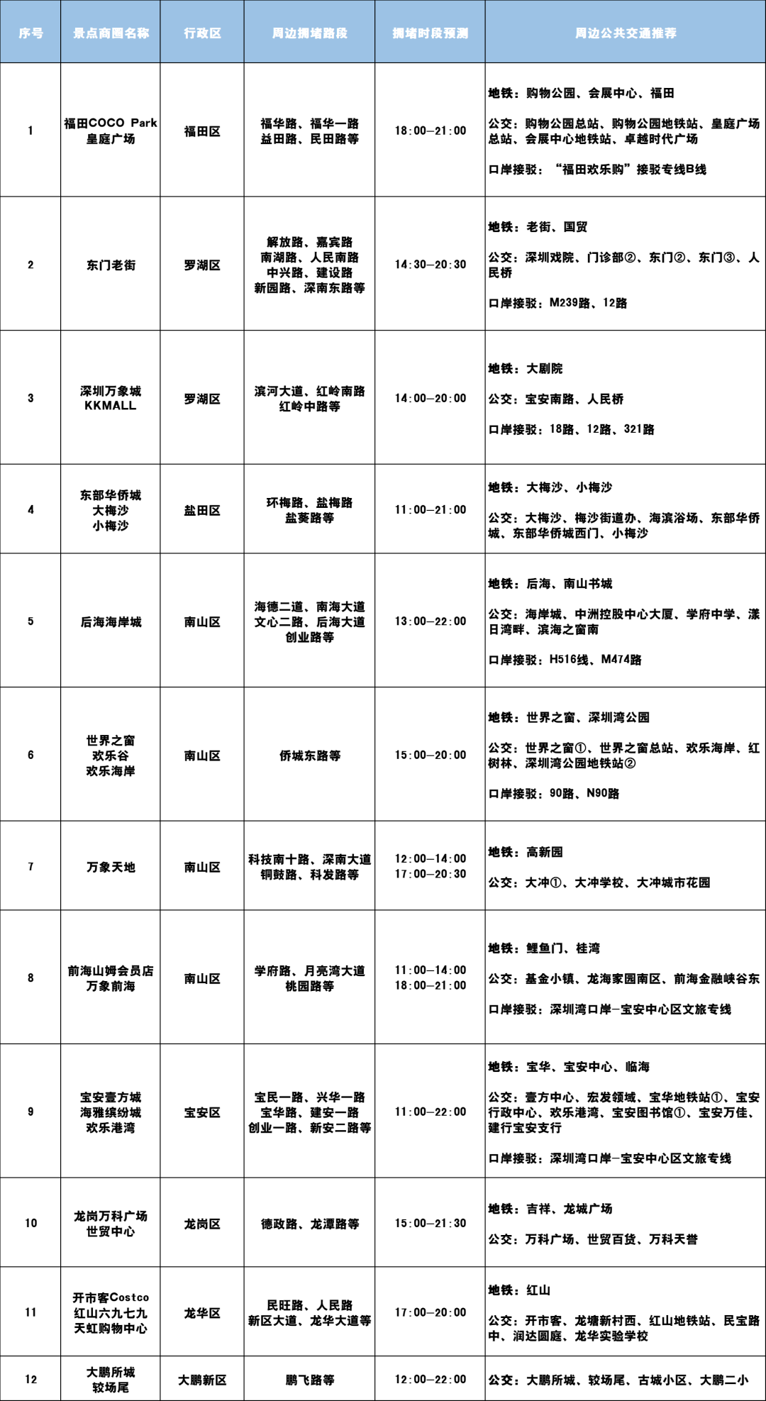 出行热度较高的景点和商圈有福田COCO Park-皇庭广场、东门老街、深圳万象城-KKMALL、东部华侨城-大梅沙-小梅沙、后海海岸城、世界之窗-欢乐谷-欢乐海岸、万象天地、前海山姆会员店-万象前海、宝安壹方城-海雅缤纷城-欢乐港湾、龙岗万科广场-世贸中心、开市客Costco-红山六九七九-天虹购物中心、大鹏所城-较场尾等。