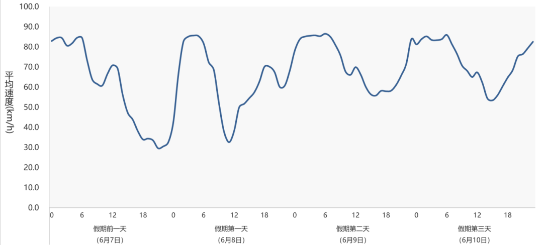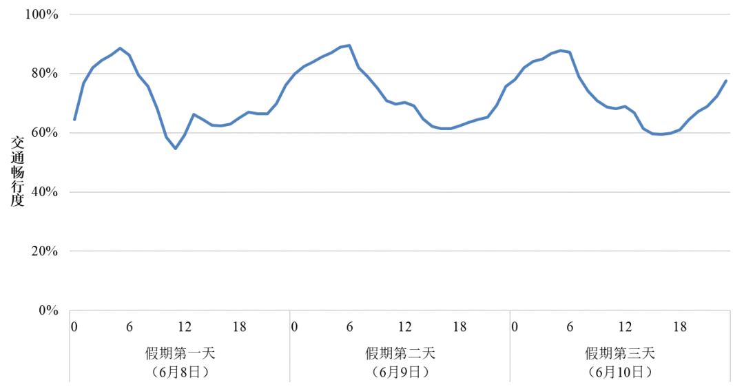 假期期间全天路网整体交通畅行度为72%,整体处于基本畅通状态,局部路段处于拥堵状态。