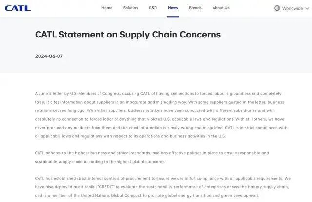 6月7日晚,宁德时代在其国际版官网发布《关于供应链问题的声明》。