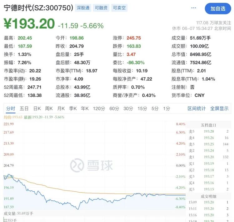 二级市场上,6月7日,宁德时代股价突发波动下跌。
