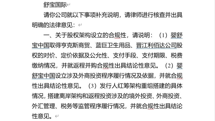 具体要求方面,证监会国际合作司请舒宝国际就以下事项补充说明,请律师进行核查并出具明确的法律意见: