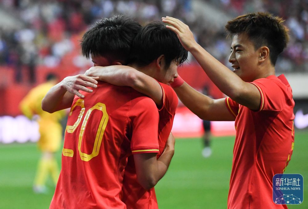 中国队球员刘诚宇(左)在比赛中进球后与队友庆祝。