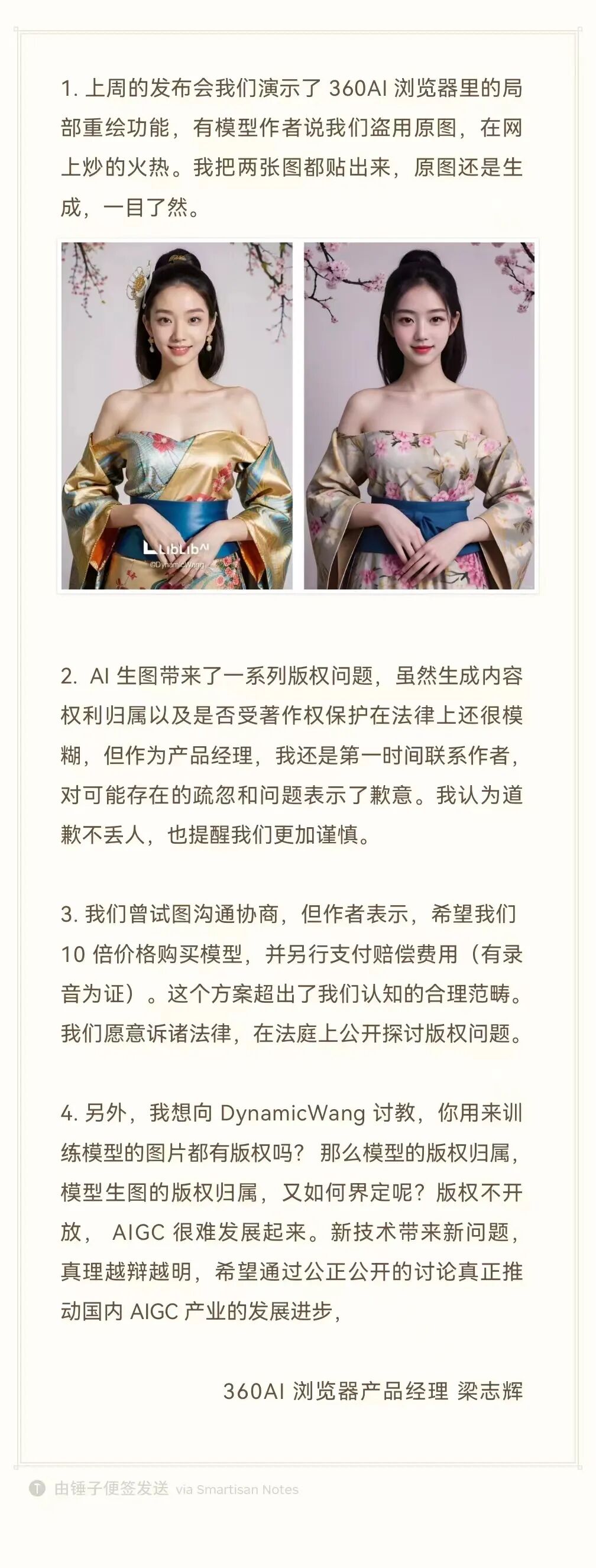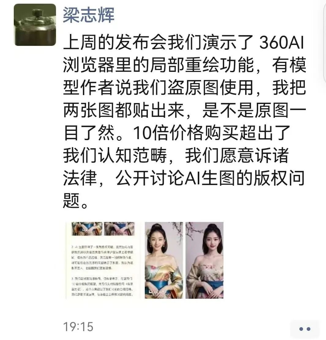 对此,梁志辉在微信朋友圈发布声明:“上周的发布会我们演示了 360AI浏览器里的局部重绘功能,有模型作者说我们盗原图使用,我把两张图都贴出来,是不是原图一目了然。”
