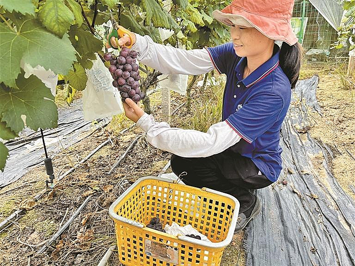 工人在坡头区坡头镇阳光玫瑰庄园采摘葡萄。 深圳晚报记者 邱志东 摄