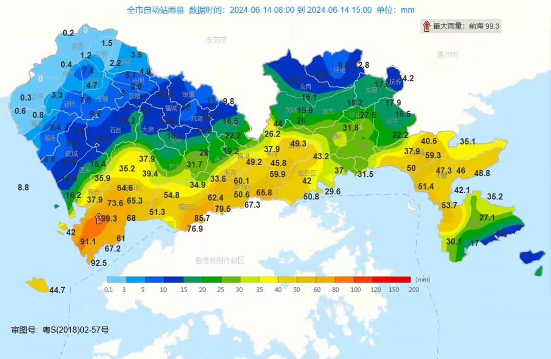 6月14日08-15时全市平均雨量34.0毫米,最大平均雨量南山区(62.0毫米),其次是福田区(57.0毫米)和罗湖(55.7毫米);全市最大雨量99.3毫米和最大1小时雨量88.5毫米均出现在南山区南山街道前海站;全市最大阵风21.2米/秒(9级,宝安区西乡街道大铲湾站)。