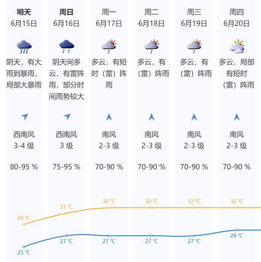 16日:阴天间多云,有雷阵雨,局部雨势较大。展望下周起降雨减弱,阳光阵雨相伴。