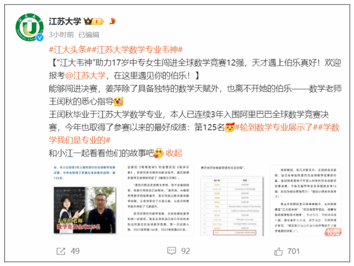 今天,江苏大学冲到了热搜第二。他们趁着这把热度,给自己做起了招生广告:“江大韦神”助力17岁中专女生闯进全球数学竞赛12强,天才遇到伯乐真好!欢迎报考江苏大学,在这里遇见你的伯乐。