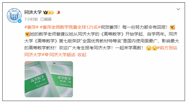 姜萍的优秀,也引来了更多高校的橄榄枝。@同济大学 发博祝贺姜萍:“每一份努力都会有回报。欢迎广大考生报考同济大学,一起来学高数!”王老师此前向姜萍推荐的自学数学教材中,第一本便是同济大学出版的《高等数学》。