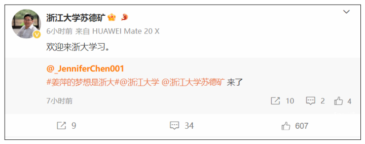 浙江大学苏德矿教授也转发了姜萍的相关报道,并表示“欢迎来浙大!”