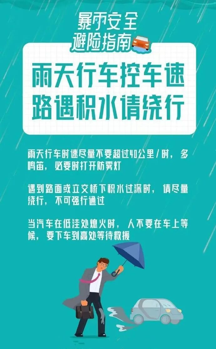 2.周末强降水易发多发,地质灾害、城市内涝和道路积水风险高,雨时应尽快远离河道、低洼易涝区等危险区域,尽量在室内暂避,减少不必要的户外活动和作业,绕开积水路段,注意出行安全。
