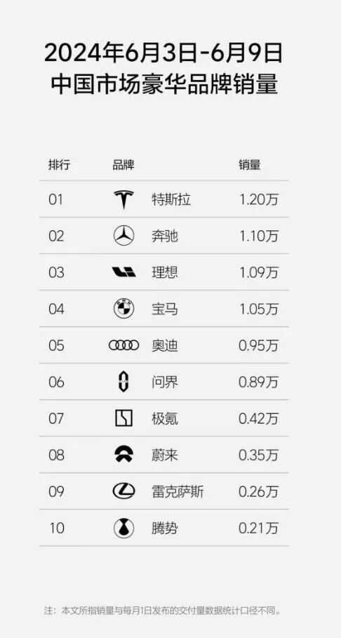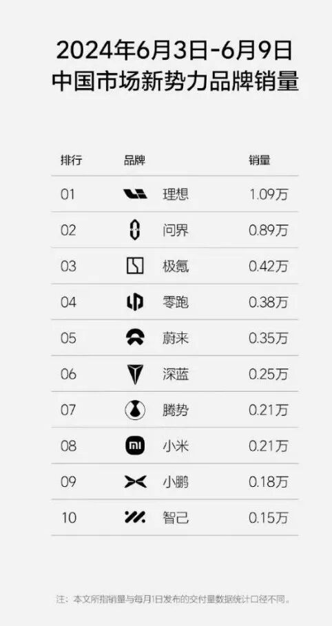6月12日,理想汽车公布今年第23周(6.3-6.9)的交付数据,周销量飙升至1.09万辆,连续7周领跑中国市场新势力品牌销量榜,更是首次在单周销量上超过宝马和奥迪,冲进中国豪华车市场销量前三,创造中国品牌的全新历史。