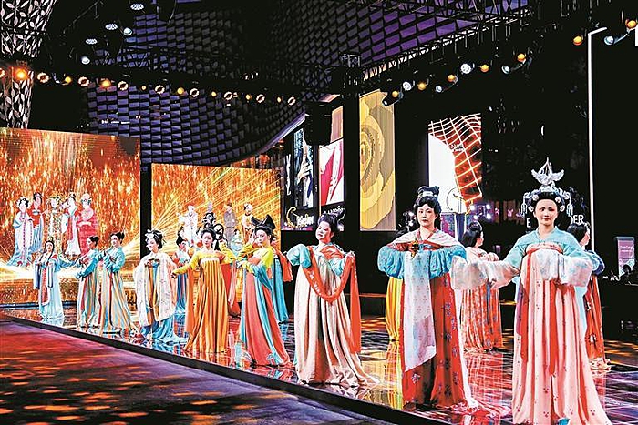 6月15日晚,“观唐·悦赏——唐代服饰艺术再现2024巡展中国首站暨深潮文化周”重点活动“唐服艺术大秀”在深圳节日大道璀璨启幕,这场沉浸式的唐服T台大秀,让壁画与陶俑中的唐风美人“活起来”,重现盛唐衣冠的华丽与精美,演绎中华传统文化的悠远魅力和时代活力。